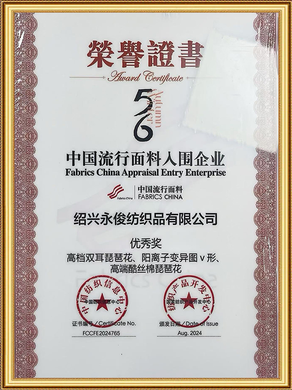 Yongjun Textile, opgericht in 2003 en gevestigd in China Light Textile City, een van de belangrijkste lichte textielmarkten van Azië, grenst aan de internationale luchthaven Hangzhou Xiaoshan, met handig transport en goed ontwikkelde communicatie. Het bedrijf beschikt over onafhankelijke import- en exportrechten en is gespecialiseerd in de productie en verkoop van een breed scala aan geweven en gebreide voeringen, waaronder jacquard-, effen, twill-, satijnen en andere geverfde voeringen, evenals voeringen die zijn verwerkt met behulp van verschillende technieken zoals garenverven, reliëfdrukken, glazuren, bedrukken, coaten, heetstempelen, uitbranden en composiet. De belangrijkste materialen die in de producten worden gebruikt zijn polyester, polyester-katoen, katoen, rayon, nylon, acetaat, enz. Sinds de oprichting heeft het bedrijf consequent vastgehouden aan de bedrijfsfilosofie van "streven naar hoge normen (voortdurend verbeteren en verfijnen), nauwkeurigheid (duidelijk en nauwkeurig), snelheid (snel voldoen aan de behoeften van klanten) en innovatie (constante innovatie)", en streeft het ernaar klanten producten en diensten van hoge kwaliteit te bieden.